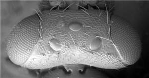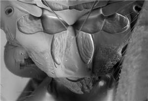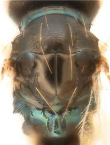 Scutellum smooth and shiny, metallic dark purple; forewing speculum open below; vertex with raised and weak reticulation; hind tibial spur long, LS/LT = 0.33.< /FONT >