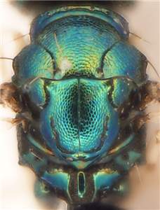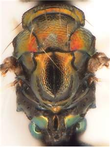 Female scape yellowish-white; female flagellum stout; mesoscutum metallic golden-purple, bluish-green, or golden-green, in male frequently golden-red, with anterior 2/3 with raised and weak reticulation, posterior 1/3 with engraved reticulation; scutellum metallic bluish-purple, bluish-green, or golden-green, in male frequently golden-red, with engraved and weak reticulation; propodeum with submedian grooves 1.3X as wide as median carina and completely reticulate, median carina reticulate posteriorly and strongly narrowed posteriorly; first gastral tergite with posterior ½ with punctures or with weak reticulation. See also acragus, cohnorum, clavicornis, cockerelli and jimenezi.