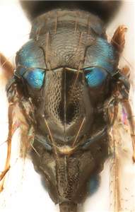 Female scape black, femora and tibiae dark brown; male scape bright golden-green with red tinges and enlarged, widest close to base; propodeum with submedian grooves and anterolateral foveas reticulate with small-meshed and strong reticulation, median carina visible only in anterior ˝; female petiole 1.8X as long as wide.