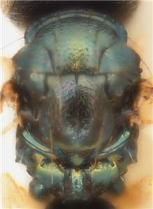 Mesoscutum golden-green with raised and strong reticulation, notauli as narrow and distinct grooves in posterior ½; scutellum metallic dark purple with green tinges, with raised reticulation; propodeal callus with four setae; female gaster ovate, MM/LG = 1.1-1.2, with first tergite 0.6X as long as length of gaster.< /FONT >