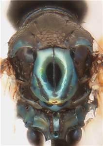 Mesoscutum metallic dark purple with raised and strong reticulation; scutellum golden-green; propodeal callus with 5-7 setae; petiole long, LP/WP = 1.6 in female, = 2.4 in male; 1st gastral tergite in female large, 0.7X as long as gaster; female gaster short, MM/LG = 1.2-1.3.