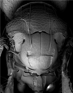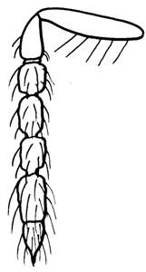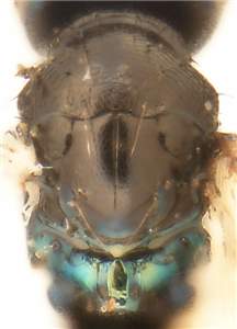Female with a narrow protrusion from antennal spicule in most specimens (protrusion may be something excreted from the antenna that sometimes brakes off); mesoscutum metallic dark purple to metallic bluish-green with engraved and weak reticulation, notauli indistinct but indicated as shallow impressions in posterior part; scutellum metallic dark purple with engraved and weak reticulation; propodeum metallic bluish-green with submedian grooves smooth and shiny; femora and tibiae dark brown. See also anabius.