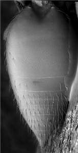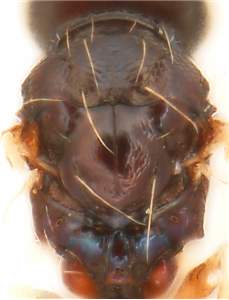 Female flagellum stout and densely setose; mesoscutum and scutellum black with metallic blue tinges, to metallic dark purple, mesoscutum with raised and rather strong reticulation, scutellum with engraved and very weak reticulation; femora dark brown with metallic blue tinges; tibiae dark brown to pale brown; gaster with first tergite with punctures in medioposterior ½. Similar to latrodecti but with longer propodeum and with flagellum densely pilose.