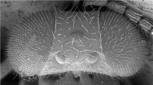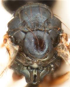 Eyes large, DE/DO = 3.8; mesoscutum and scutellum black with metallic blue tinges; scutellum with engraved reticulation; costal cell with four setae on ventral surface; gaster with first tergite smooth.< /FONT >