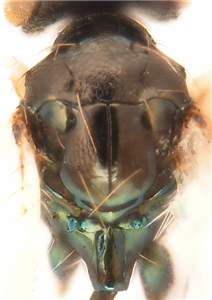 Vertex with engraved and weak reticulation to predominantly smooth, posterior part with a median groove; mesoscutum with raised reticulation in both sexes; propodeal callus with 6-7 setae; coxae dark and metallic in both sexes; costal cell bare; petiole 2.3X as long as wide in female, 3.5X in male; first gastral tergite with posterior ½ reticulate; male scape white. Similar to albiscapus, differs in having engraved reticulation in posterior 1/3 of midlobe of mesoscutum in female, and in having predominantly engraved reticulation on scutellum in male.