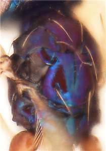 Midlobe of mesoscutum with posterior 1/3 with raised reticulation; scutellum with engraved reticulation; mesoscutum metallic purple, scutellum bright metallic bluish-purple; hind tibial spur long, LS/LT = 0.56; gaster with 1st tergite smooth and shiny.