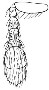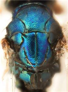 Antennal clava in female strong , 2.6X as wide as width of 1st flagellomere, and with a large ovate sense area ventrally; clava rounded at apex; clavomere 1 longer than 2; 3rd flagellomere distinctly transverse, 0.5X as long as wide; pedicel dark brown and flagellomeres pale brown in both sexes; mesoscutum golden-green with blue tinges, scutellum metallic bluish-purple; notauli as narrow and distinct grooves in posterior ½; propodeum with submedian grooves 1.3X as wide as width of median carina  in both sexes; female petiole 1.0X as long as wide.