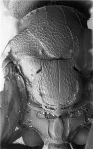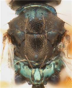 Scutellum with a combination of raised and engraved reticulation, and with a median groove that reaches slightly more than ½ the length of scutellum; frons between toruli protruding, forming a pointed “nose”; clypeus protruding and bilobed; female scape stout, 2.5X as long as wide; propodeal callus with 6-8 setae; male antenna with all flagellomeres distinctly separated. See also nasutus.