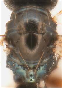 Flagellum short with prominent longitudinal sensillae; eyes small, DE/DO = 5.7; mesoscutum black with metallic blue tinges with raised and weak reticulation, midlobe with posterior ½ with engraved reticulation; scutellum metallic dark purple with engraved and very weak reticulation; female gaster short, MM/LG = 0.9. Similar to peltruchus but with smaller and smooth 1st gastral tergite.