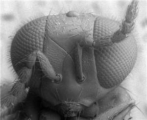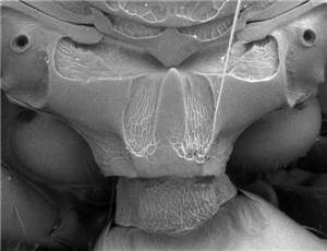 mantis, but sibynatus with smaller eyes, DE/DO = 4.8, female scape widest at base.< /FONT >