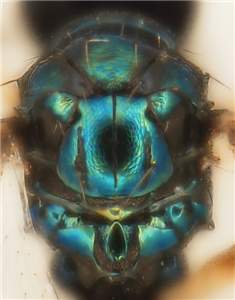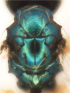 Midlobe of mesoscutum with posterior 1/3 with engraved reticulation; scutellum wide, 0.9X as long as wide, lateral mesh-rows situated half-way between median groove and lateral margin of scutellum; mesoscutum and scutellum metallic bluish-purple, bluish-green or golden-green; hind tibial spur long, LS/LT = 0.53; propodeum with median carina relatively short and wide, LC/WC = 2.0, with sides rounded. Similar to aeneicollis but with longer petiole and with a longer hind tibial spur; also similar to dorypher but with shorter petiole. See also hylaeus, livens and panamensis.