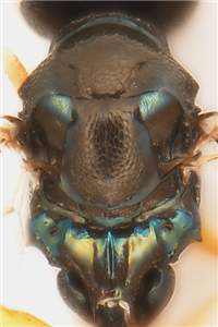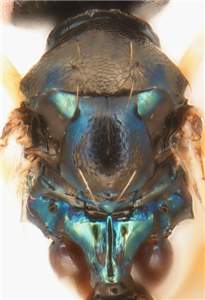 Midlobe of mesoscutum with posterior 1/3 with raised reticulation; scutellum with raised reticulation, predominantly reticulate, median groove indicated in female but not in male; vertex with raised and weak to strong reticulation; coxae dark brown with metallic tinges; head in frontal view triangular; antenna long and slender; forewing speculum open below and towards base of wing; propodeum with median carina long, narrow and parallel-sided, LC/WC = 7.5; female petiole transverse, 0.5X as long as wide, male petiole 1.7X as long as wide; male flagellum with all flagellomeres distinctly separated.< /FONT >