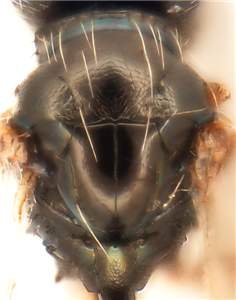 Scape, femora and tibiae dark brown; scutellum smooth and shiny; gaster elongate, MM/LG = 0.8, with first gastral tergite smooth with very weak reticulation in posterior ¼; gaster with strong setation anterolaterally. Similar to tumidus but with gaster shorter and with strong setation anterolaterally.