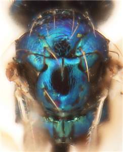 Eyes large, DE/DO = 3.6; midlobe of mesoscutum with posterior 1/3 with engraved reticulation; mesoscutum and scutellum metallic bluish-green; hind tibial spur long, LS/LT = 0.57. Similar to dorypher and pilatus but with larger eyes.