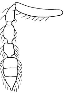 Mouth opening narrower than height of eye (ratio HE/MO= 1.5); marginal vein with a regular row of 10 strong setae along anterior margin; hind coxa with a thin tuft of hair on posterior surface; petiole 1.3X as long as width of base in female, 2.3X in male; first gastral tergite in both sexes with a row of setae (not a tuft) to either side of base of petiole.