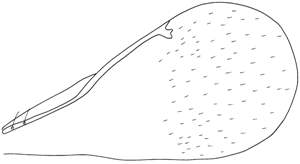 Medioposterior margin of dorsellum drawn out in a tip; mouth opening narrower than height of eye (ratio HE/MO= 1.7); marginal vein without strong setae along anterior margin; hind coxa with a few scattered hairs on posterior surface; gaster without hairs anterolaterally.