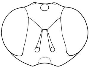 Eyes large, ratio of width between eyes at the level of anterior ocellus/width of head= 0.42; head and mesosoma bright green; scutellum with rather strong reticulation, meshes slightly elongate and diverging posteriorly, medioposterior 1/6 smooth; fore wing speculum open below; posterior margin of dorsellum tridentate; propodeum with median groove, narrow throughout, submedian carinae weak; propodeal callus with 2-3 setae; petiole as long as wide in female, 1.5X as long as wide in male; first gastral tergite in female reticulate in posterior 1/3, meshes isodiametric.