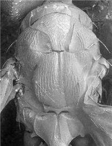 Frons and vertex predominantly smooth; scutellum with a median groove in anterior 1/3-1/2, with weak reticulation, meshes elongate and parallel, posterior 1/4 smooth; posterior margin of dorsellum tridentate; propodeum with a narrow median groove, submedian carinae absent; petiole 0.8X as long as wide in female, 1.2X as long as wide in male; first gastral tergite in female smooth.