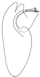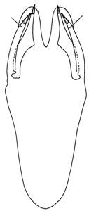 Paramere long and narrow with a strong seta at apex and with a weak seta subapically, in lateral view paramere is strongly curved; parameral plates protruding dorsally, protrusion rounded at apex; digitus strongly flattened, in ventral view 4.4X as long as wide, in lateral view pear-shaped and 1.5X as long as wide, with a strong spine apically.