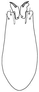 Paramere protruding, lateral margins parallel, apical part abruptly cut off, with two subapical setae, these equal in length; digitus 2X as long as wide, with a spine in inner half, outer apical corner slightly drawn out in a blunt tip, base of digitus sickle-shaped.