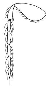 Scape wide, widest below middle, 2.2X as long as wide, inner and outer surface smooth and shiny; paramere elongate and narrow, setae thin and short, one placed below apex, the other at base of paramere; digitus elongate, 2X as long as wide, with a strong spine.