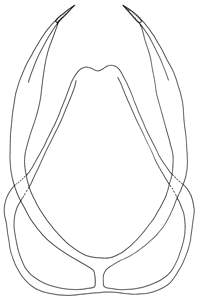Parameres and parameral plates long and narrow, paramere with a strong spine at apex, parameral plates connecting to remainder of phallobase through a short stalk; digitus missing.