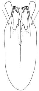 Paramere strongly protruding, elongate, pointing straight backwards, with a strong spine at apex, subapical seta long and thin; parameral plates large and meeting at base but separated and diverging in apical part, rounded at apex; digitus 2X as long as wide, with a strong spine in inner half.