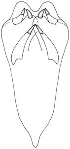 Paramere split in two separate parts, one long and narrow branch from middle of phallobase and with a very strong seta at apex, the other branch flattened and from upper one-half of phallobase and with a strong seta at apex; parameral plates protruding dorsally, protrusion rounded at apex; digitus 2X as long as wide, with a strong spine apically.