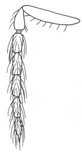 Scape narrow, flagellum with numerous white setae. Paramere rounded off at apex, hardly protruding; setae long and thin, one at apex, the other below. Digitus as long as wide, with two almost equally large spines.