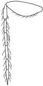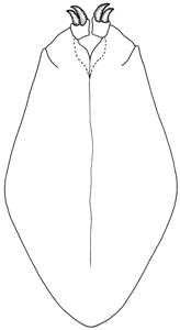Scape wide, 2.6X as long as wide; paramere not protruding, without setae or spines; digitus as long as wide, with two strong spines, these situated close and touching, outer spine slightly smaller than inner spine.