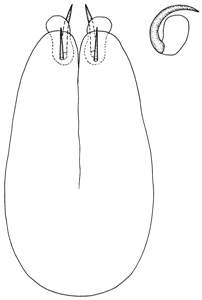 Paramere not protruding, with a strong seta below apex; digitus in lateral view rounded and 1.6X as long as wide, with a strong sickle-shaped spine at apex.